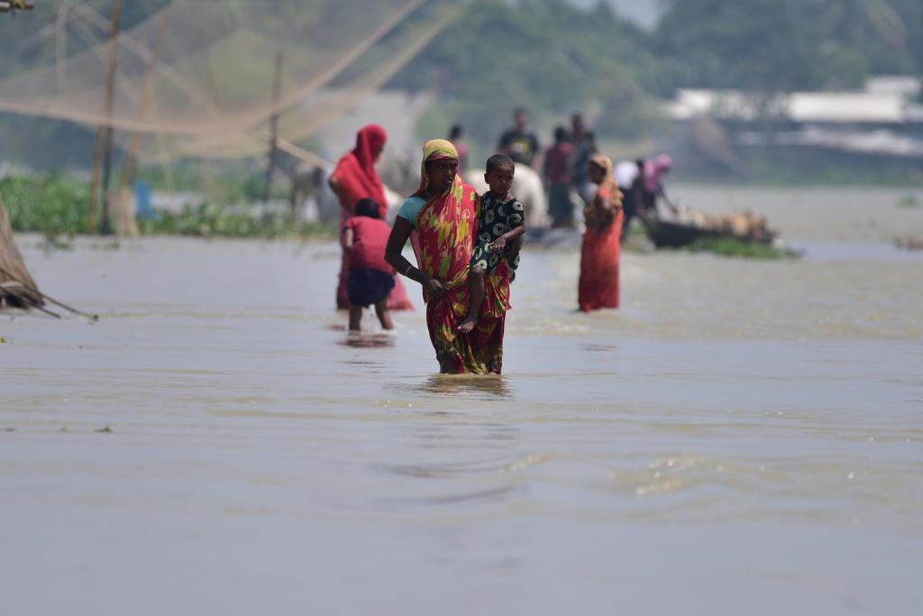 8月30日,人們在印度東北部阿薩姆邦一處洪災區域涉水出行。