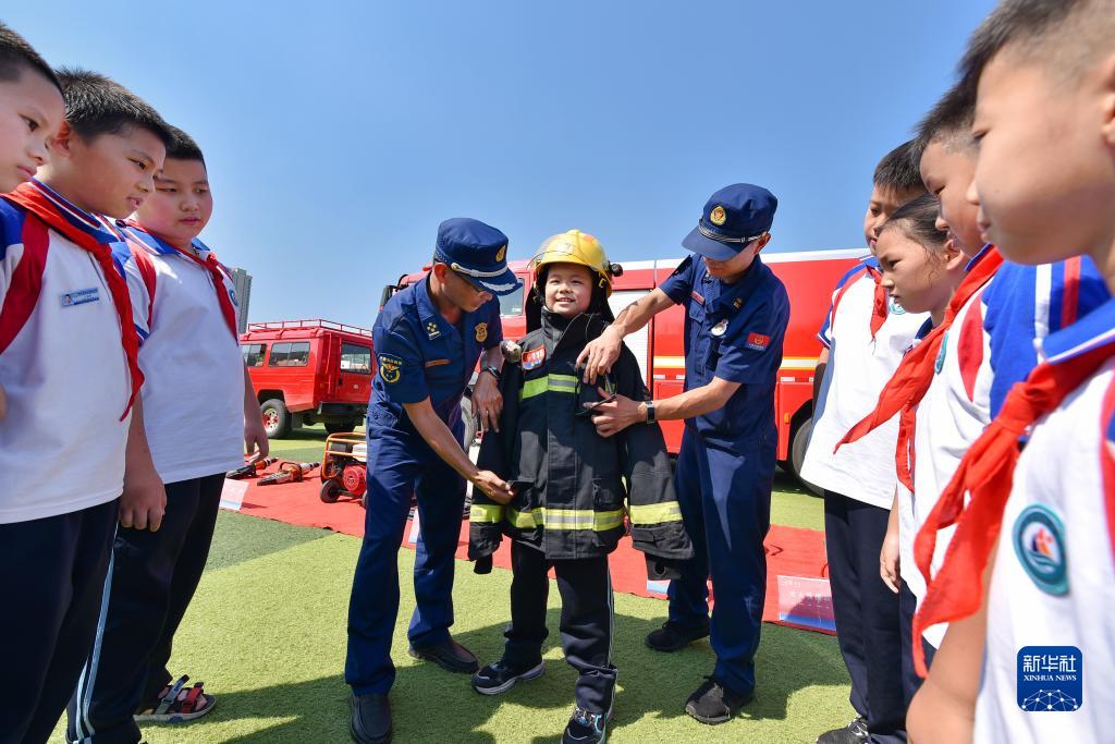 8月31日,在山東鄒平市黃山實(shí)驗小學(xué),小學(xué)生體驗穿著(zhù)消防救援服。