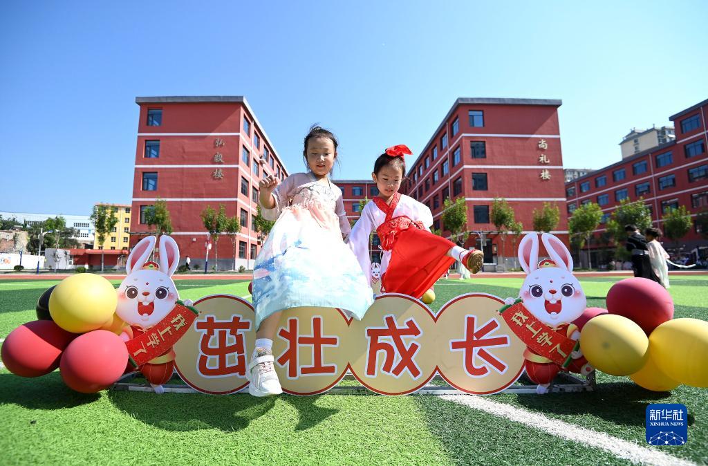 8月31日,河北省邯鄲市峰峰礦區滏北小學(xué)的一年級新生在進(jìn)行“跨欄禮”。