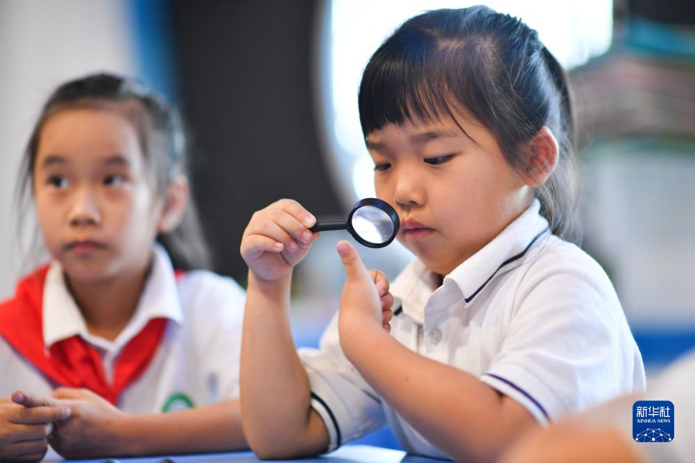 8月31日,在西安市鄠邑區新區小學(xué),學(xué)生在科技主題開(kāi)學(xué)第一課上學(xué)習使用放大鏡。