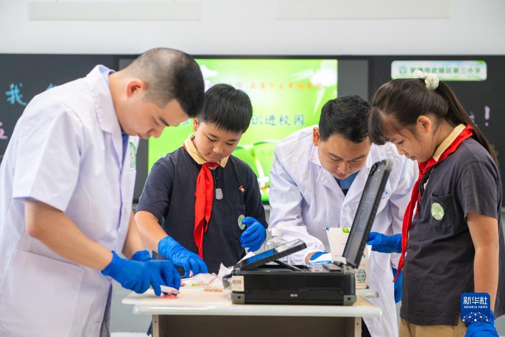 8月31日,湖南省常德市市場(chǎng)監督管理局在常德市武陵區第三小學(xué)開(kāi)展關(guān)于食品安全的“開(kāi)學(xué)第一課”。這是工作人員指導學(xué)生進(jìn)行食品安全快速檢測實(shí)驗。