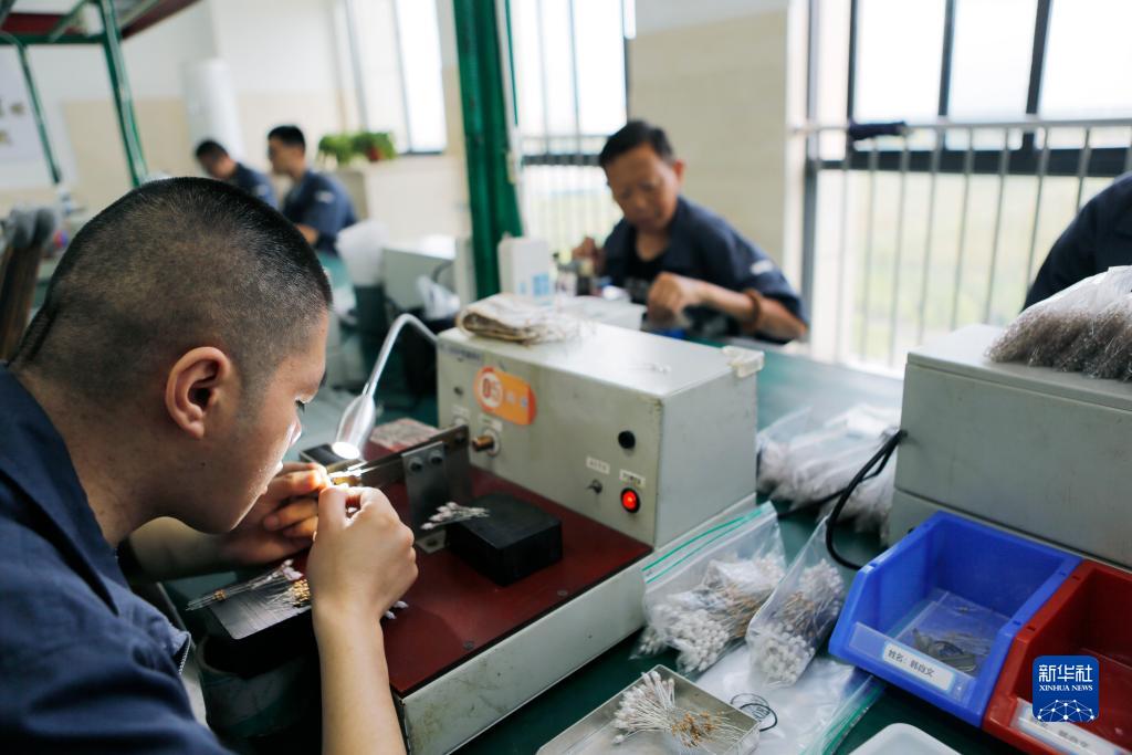 8月30日,在鹽城市殘疾人托養中心就業(yè)托管車(chē)間,學(xué)員在加工氖燈。