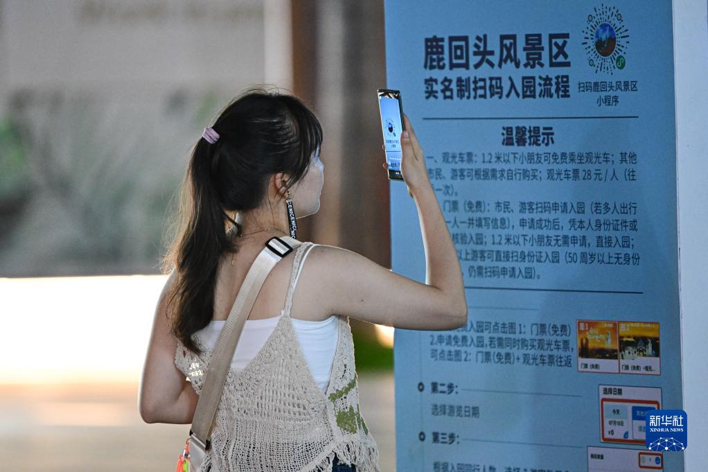 8月29日,游客在鹿回頭風(fēng)景區外掃碼預約免費門(mén)票。