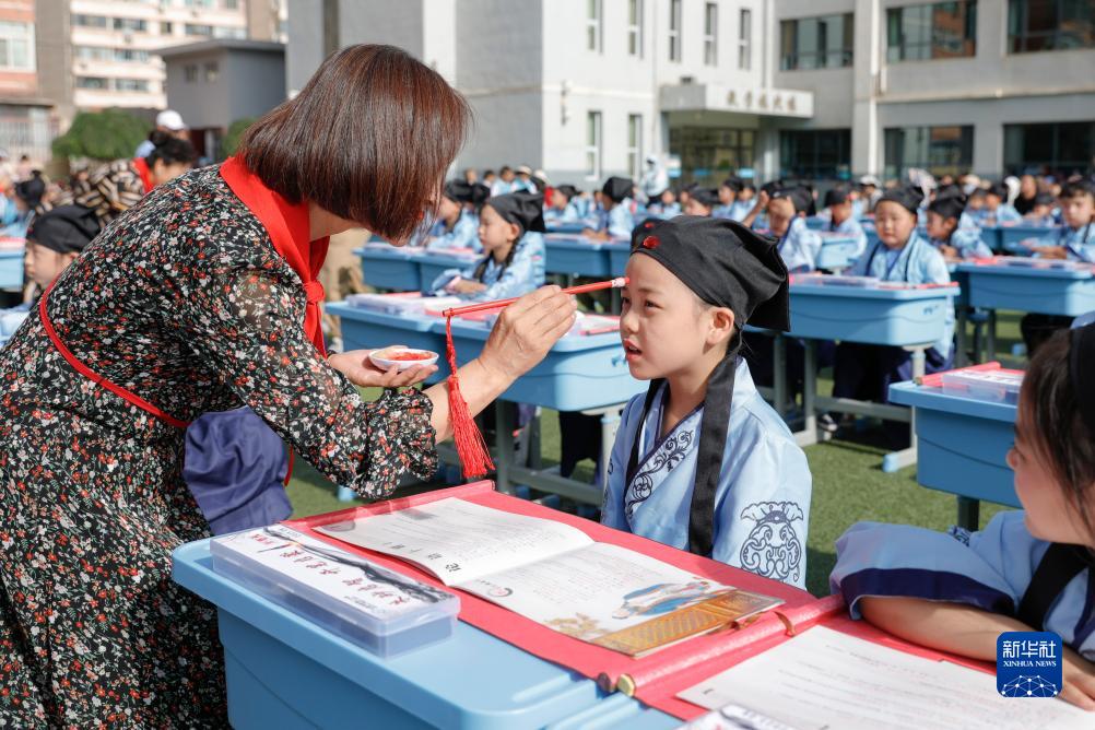 9月1日,在甘肅省蘭州市七里河區第二小學(xué),老師在為一年級新生點(diǎn)朱砂啟智。