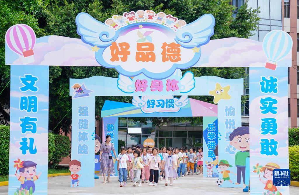 9月1日,福建省福州金山小學(xué)老師帶領(lǐng)一年級新生熟悉校園。