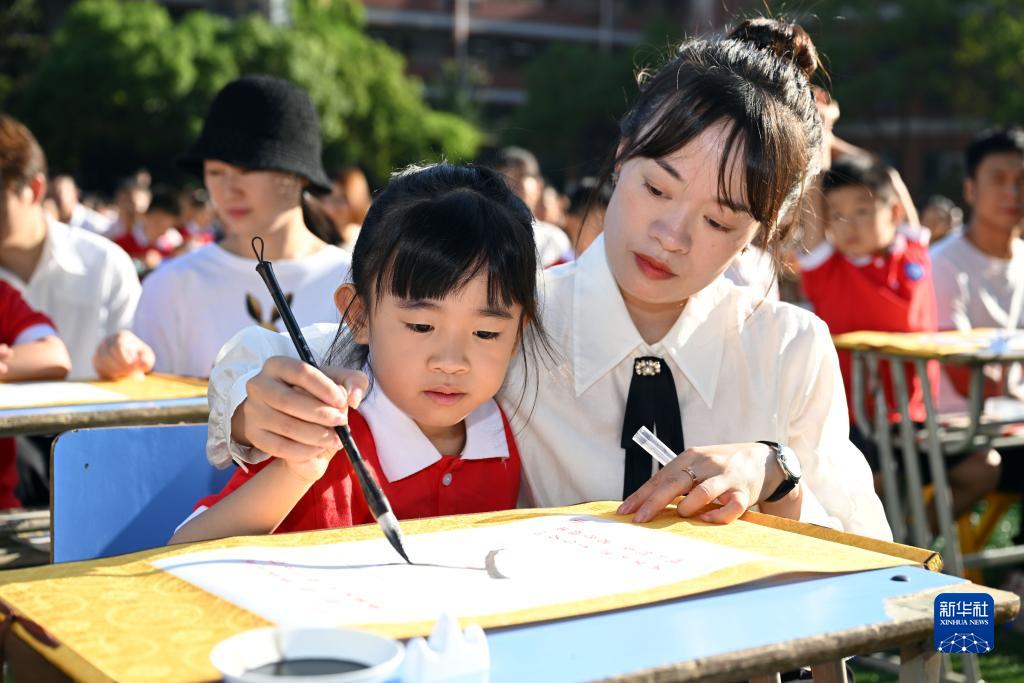 9月1日,在合肥市師范附屬第二小學(xué),家長(cháng)帶著(zhù)一年級新生在“開(kāi)筆禮”儀式上用毛筆寫(xiě)“人”字。