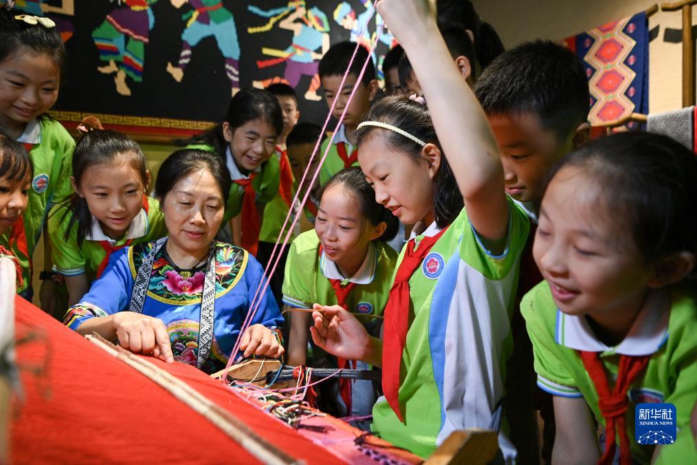 9月1日,重慶市酉陽(yáng)土家族苗族自治縣桃花源景區,非遺技藝大師在給學(xué)生們上“開(kāi)學(xué)第一課”——學(xué)習非遺“土家織錦”紡織技藝。