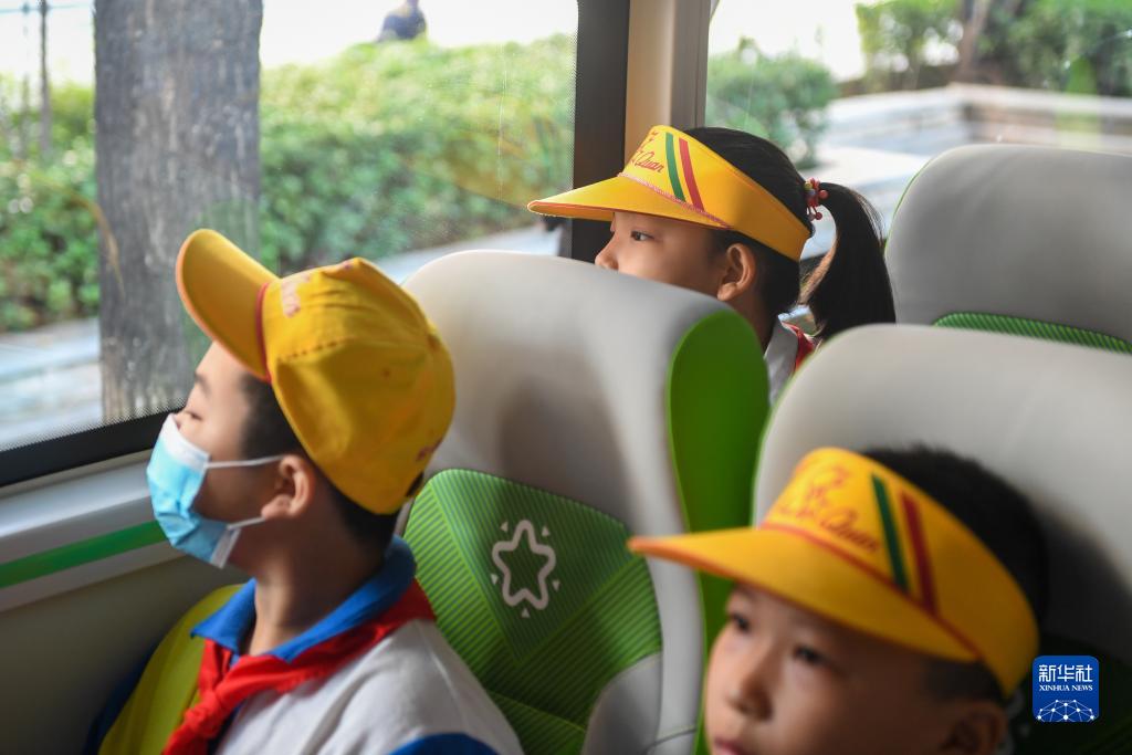 9月1日,幾位北京市豐臺區第一小學(xué)的學(xué)生在通學(xué)公交車(chē)上向外張望。