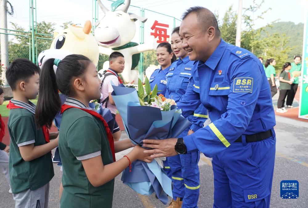 9月1日,在北京市門(mén)頭溝區京師實(shí)驗小學(xué),學(xué)生向門(mén)頭溝區藍天救援隊隊員獻花。