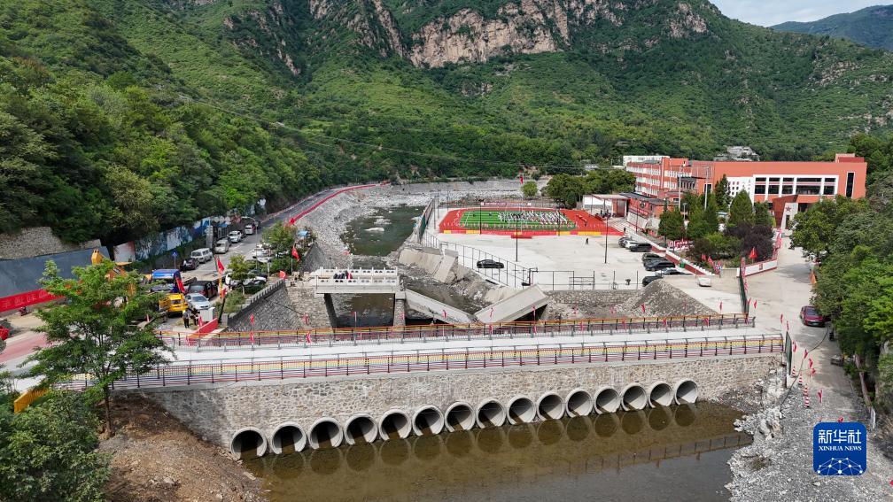 9月1日,在北京市房山區霞云嶺鄉霞云嶺中心小學(xué),因強降雨受損的學(xué)校操場(chǎng)和橋梁修繕一新(無(wú)人機照片)。