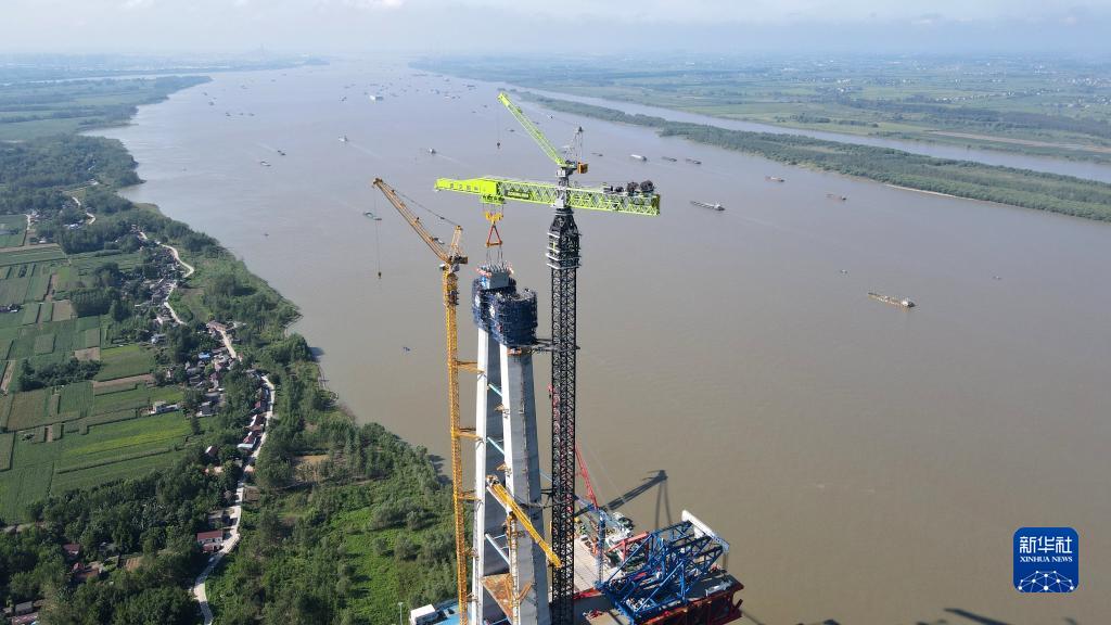 這是9月1日拍攝的中交二航局巢馬城際鐵路馬鞍山公鐵兩用長(cháng)江大橋南主塔首節段鋼塔吊裝現場(chǎng)(無(wú)人機照片)。