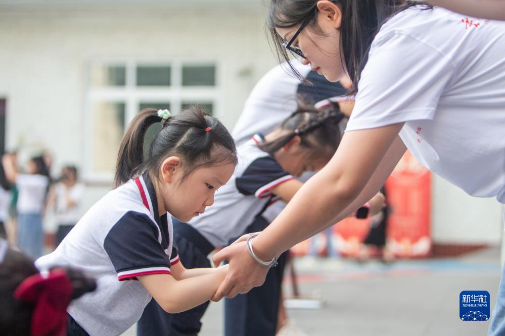 9月1日,在重慶育才實(shí)驗學(xué)校華巖校區,豆豆在開(kāi)學(xué)典禮上向老師行拜師禮。