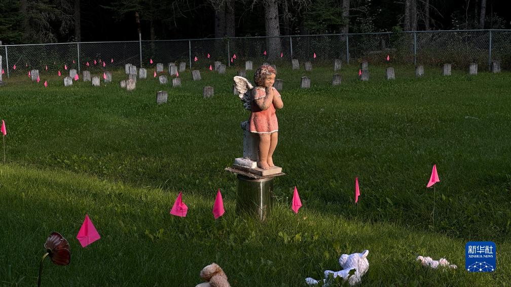 這是8月31日在加拿大薩斯喀徹溫省博瓦爾印第安人寄宿學(xué)校舊址拍攝的用粉色旗子標出的疑似兒童和嬰兒墓地。