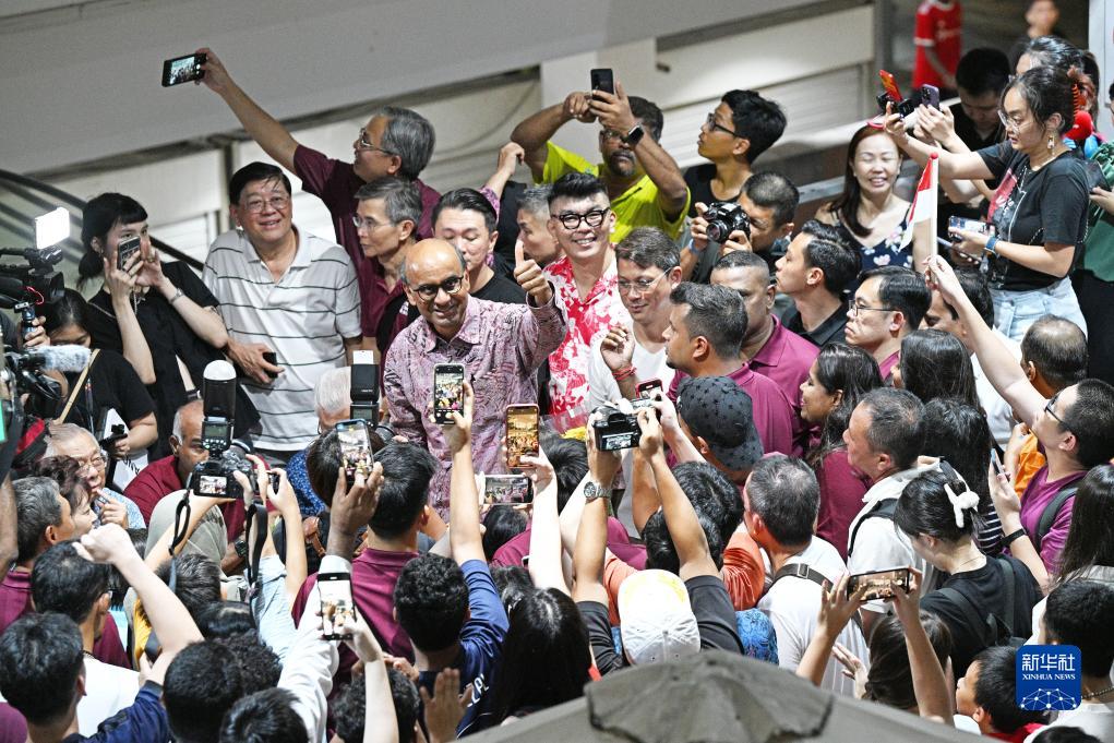 9月1日,新加坡總統候選人尚達曼(中)在裕廊等待總統選舉結果揭曉時(shí)向支持者致意。