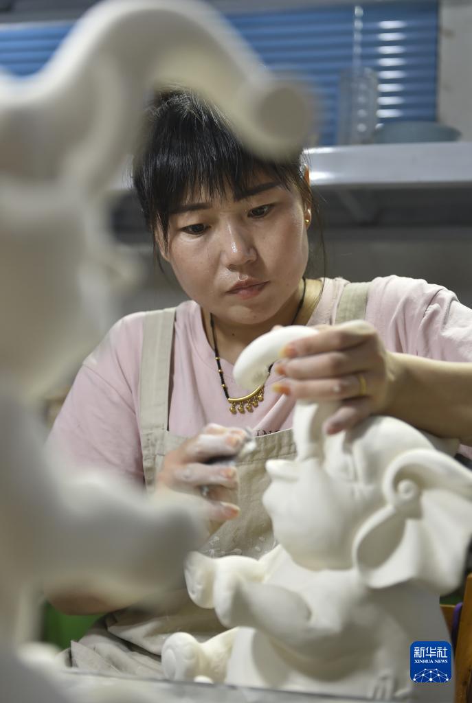 8月31日,在清涼寺村的一家汝瓷生產(chǎn)企業(yè),工作人員在車(chē)間里修坯。