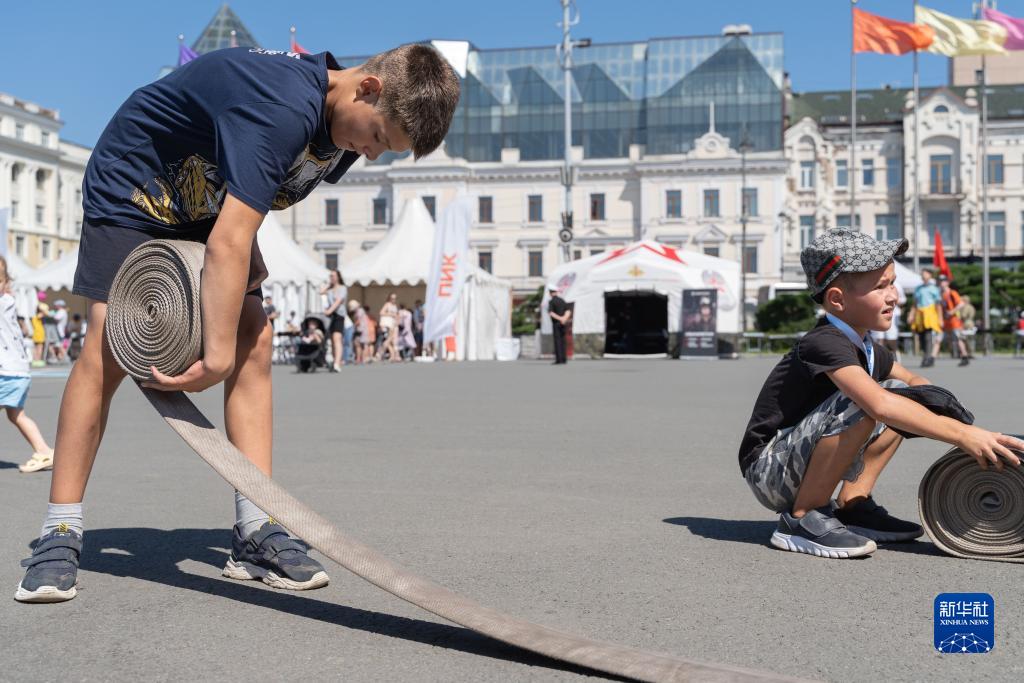 9月2日,在俄羅斯符拉迪沃斯托克舉辦的“知識日”活動(dòng)上,兩名兒童學(xué)習消防技能。