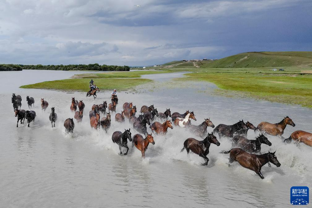 新疆伊犁哈薩克自治州昭蘇縣濕地公園景區的“天馬浴河”景觀(guān)(7月17日攝,無(wú)人機照片)。