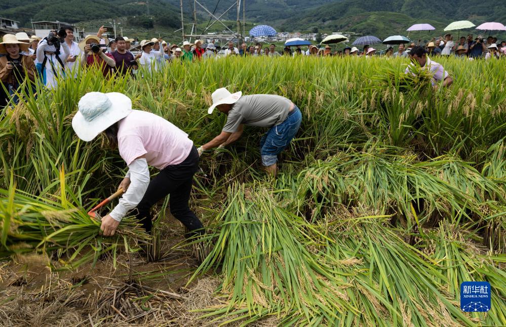 9月2日,在鹽邊縣惠民鎮興隆村的稻田里,來(lái)自惠民鎮的村民在參與稻谷收割比賽。
