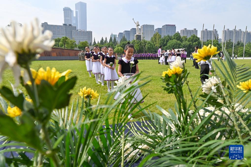 9月3日,青少年代表在侵華日軍南京大屠殺遇難同胞紀念館的中國人民抗日戰爭暨世界反法西斯戰爭勝利78周年紀念活動(dòng)中敬獻鮮花。