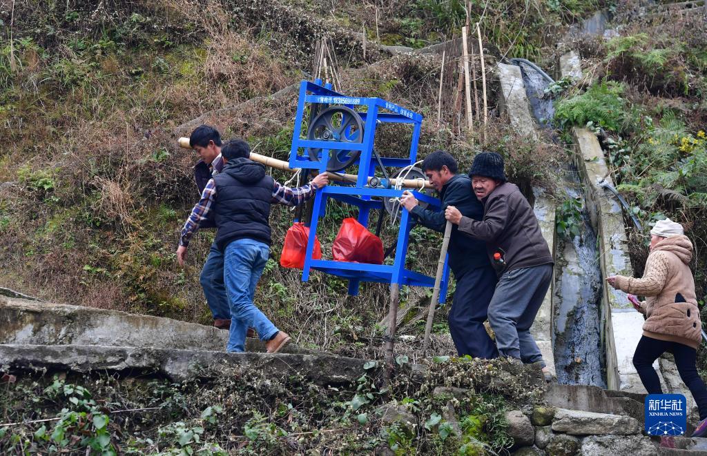 烏英苗寨村民們在搬運亮布機(2021年12月31日攝)。2021年,廣西柳州市婦聯(lián)和柳州市女企業(yè)家協(xié)會(huì )為烏英苗寨捐贈一批亮布機和捶布臺,幫助村民提高亮布制作的效率。新華社記者 黃孝邦 攝