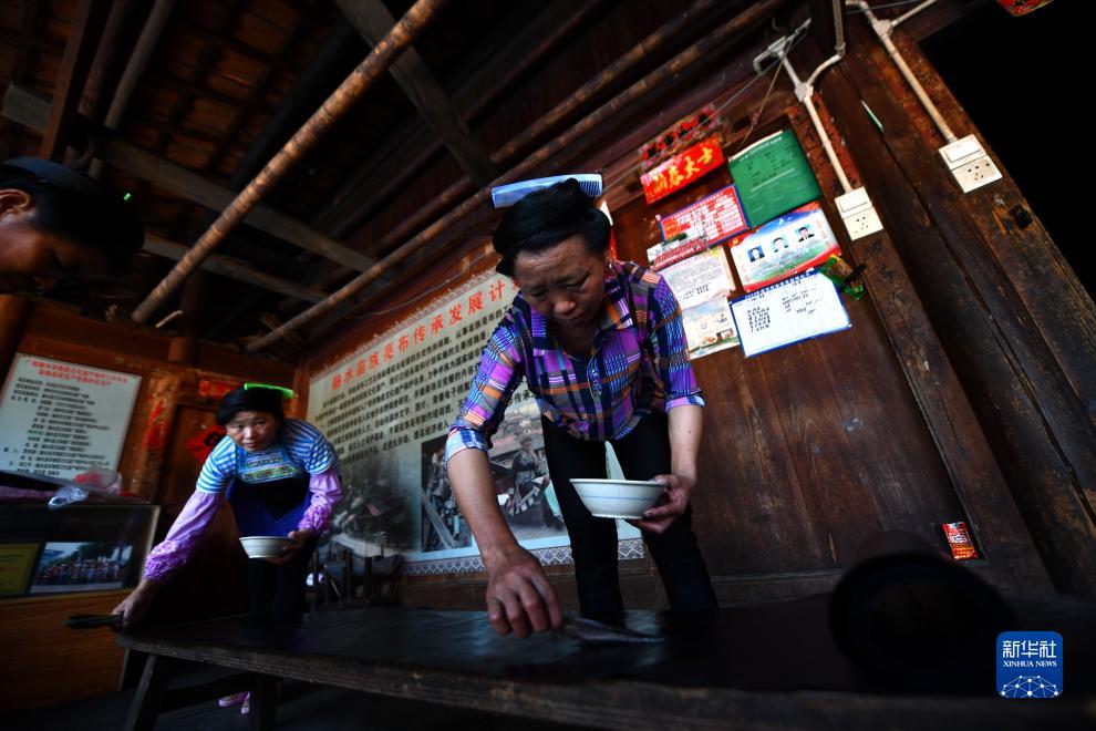 烏英苗寨婦女韋妹麗(右)在給亮布刷蛋清(2020年9月2日攝)。新華社記者 黃孝邦 攝