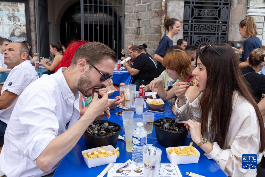 9月2日,人們在法國北部城市里爾品嘗貽貝。里爾舊貨市場(chǎng)上,“貽貝-薯條-啤酒”的組合是游客們的最?lèi)?ài)。