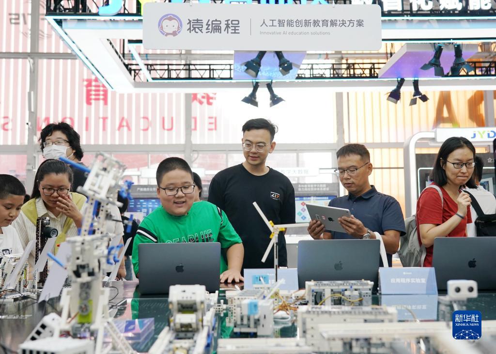 9月3日,在首鋼園教育服務(wù)專(zhuān)題展區,小朋友在體驗智能硬件編程作品。