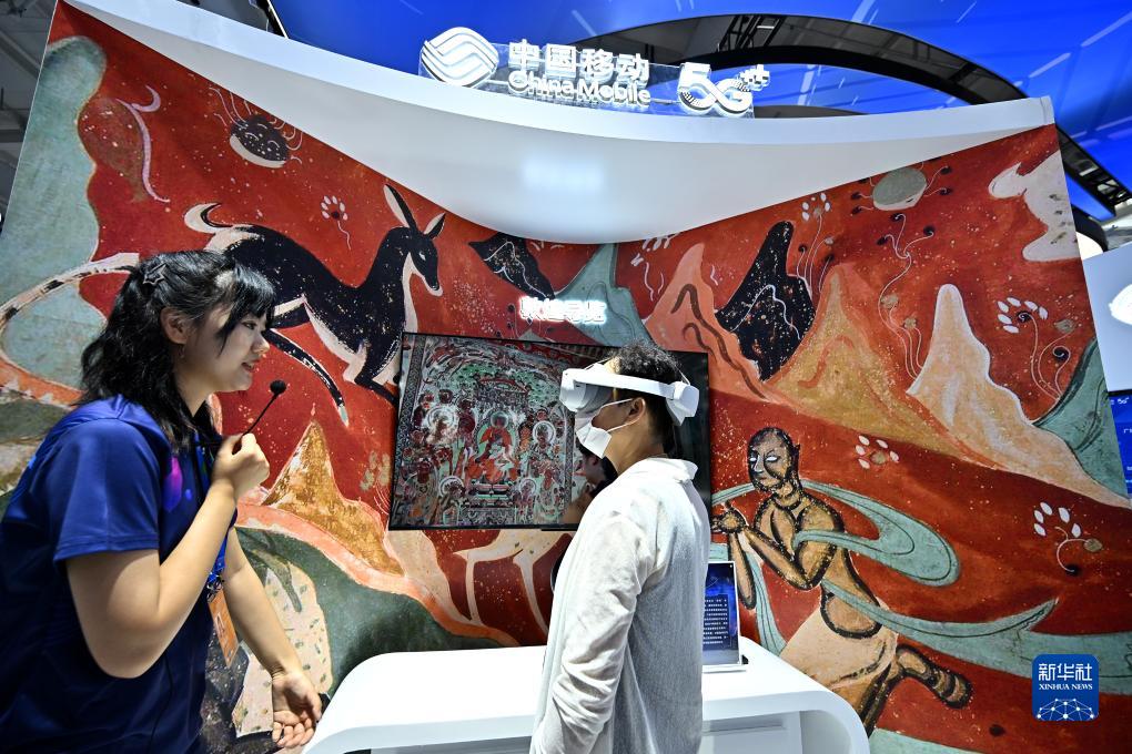 9月3日,一名參觀(guān)者在首鋼園中國移動(dòng)展臺體驗基于A(yíng)R/VR特效的敦煌導覽,沉浸式感受敦煌壁畫(huà)的魅力。