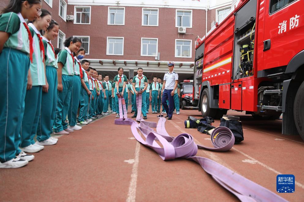 9月4日,承德市雙橋區竹林寺小學(xué)學(xué)生在消防救援隊員指導下體驗使用消防器材。