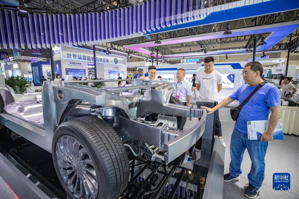 9月4日,在2023智博會(huì )浙江孔輝汽車(chē)科技有限公司展廳,觀(guān)眾參觀(guān)電控空氣懸掛系統展示平臺。