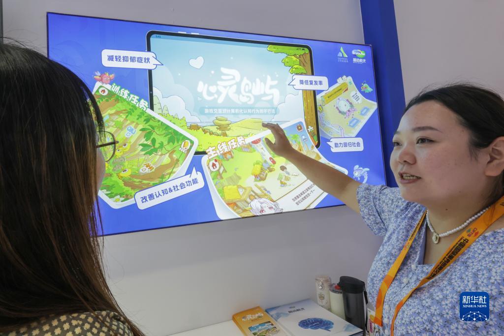 9月4日,在首鋼園健康衛生服務(wù)專(zhuān)題展區,工作人員在北京安定醫院展臺講解基于A(yíng)I的抑郁癥輔助治療系統。