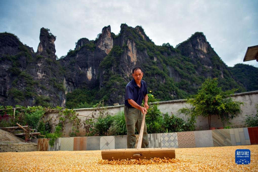 9月4日,村民在貴州省遵義市余慶縣白泥鎮民同村晾曬農作物。