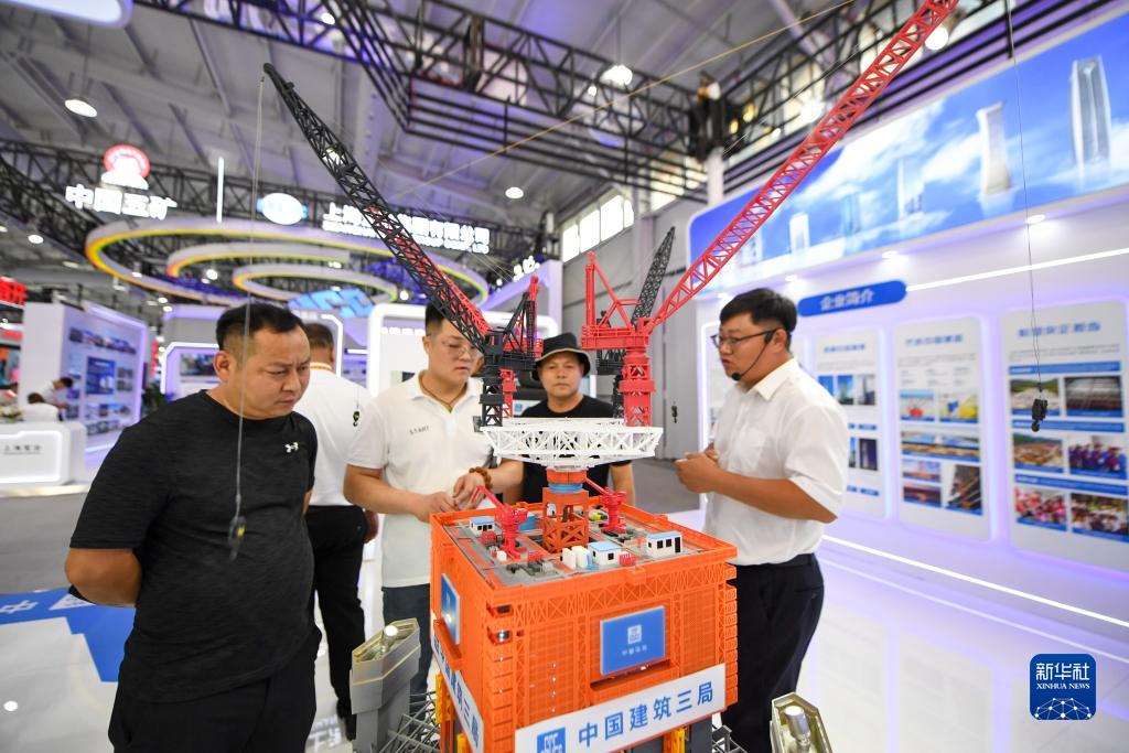 9月5日,在服貿會(huì )首鋼園區的工程咨詢(xún)與建筑服務(wù)專(zhuān)題展內,中建三局的工作人員(右一)介紹一款超高層建筑智能化施工裝備集成平臺。
