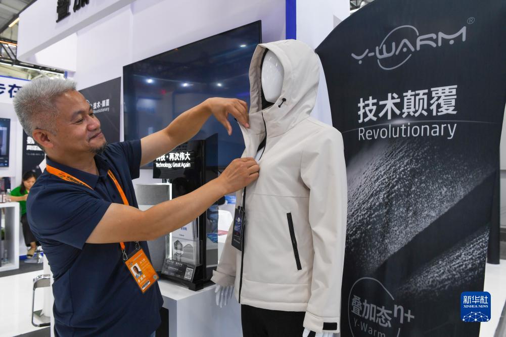 9月5日,在服貿會(huì )首鋼園區的北京“專(zhuān)精特新”中小企業(yè)展區內,一家企業(yè)展示使用新型保暖材料制作的防寒服裝。
