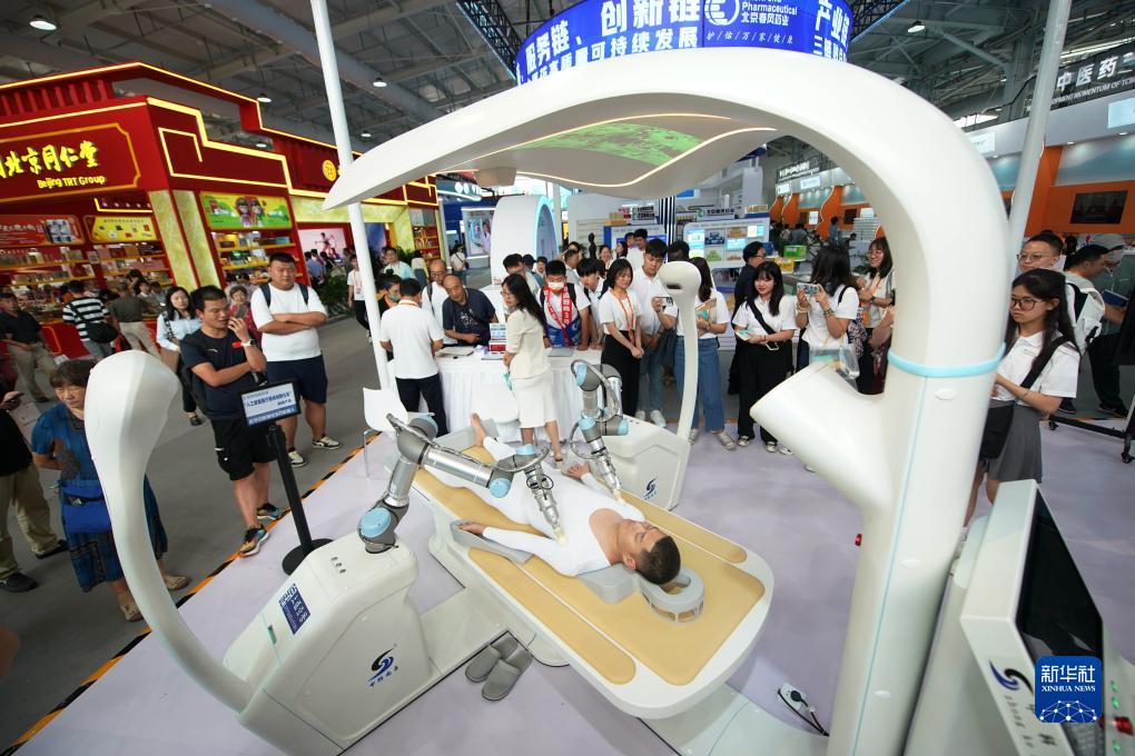 9月5日,參觀(guān)者在服貿會(huì )首鋼園區的健康衛生服務(wù)專(zhuān)題展內觀(guān)看數字中醫循經(jīng)治療機器人展示。