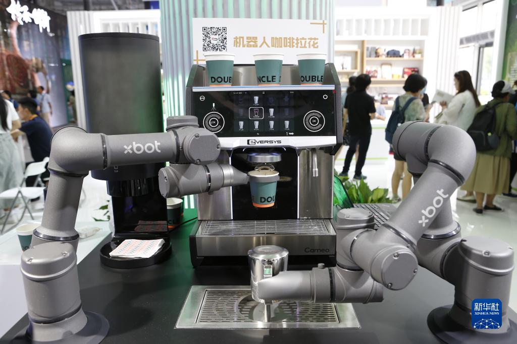 這是9月5日在服貿會(huì )首鋼園區拍攝的一款自主研發(fā)的雙機械臂咖啡機器人。該機械臂采用視覺(jué)定位和運動(dòng)控制算法,運動(dòng)精度達到亞毫米級。