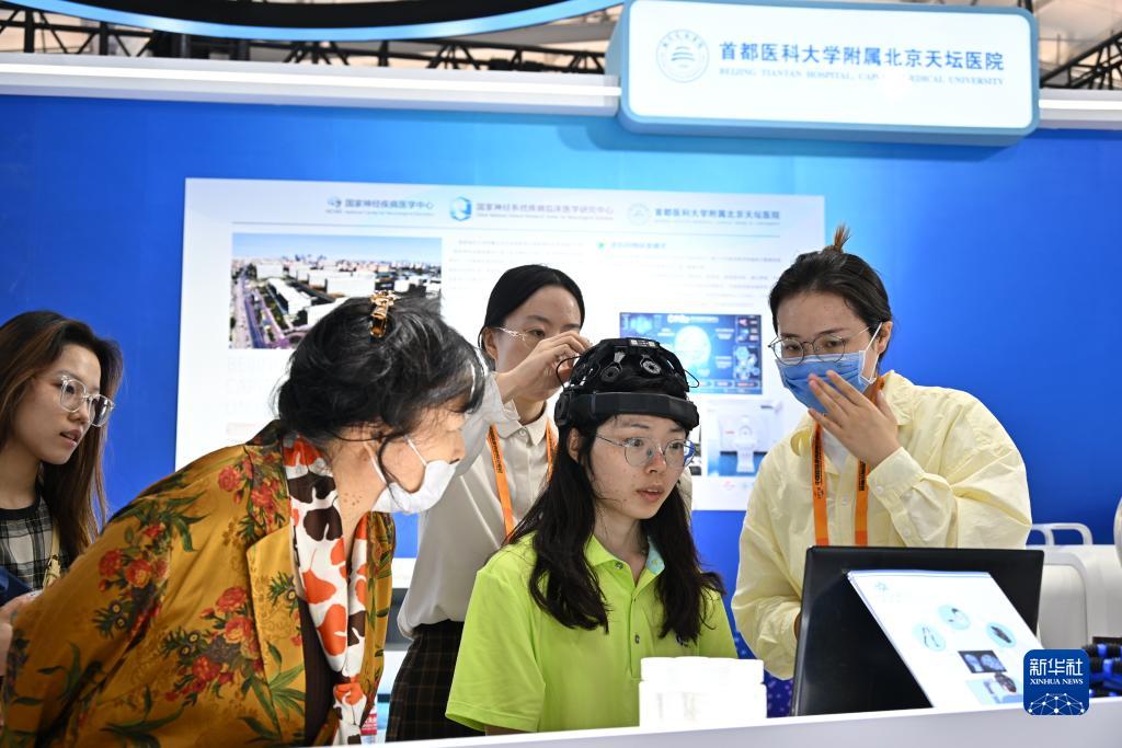 9月5日,在服貿會(huì )首鋼園區,參觀(guān)者在首都醫科大學(xué)附屬北京天壇醫院展臺體驗國產(chǎn)的腦機接口系統。該系統用于運動(dòng)障礙患者的主動(dòng)康復訓練。
