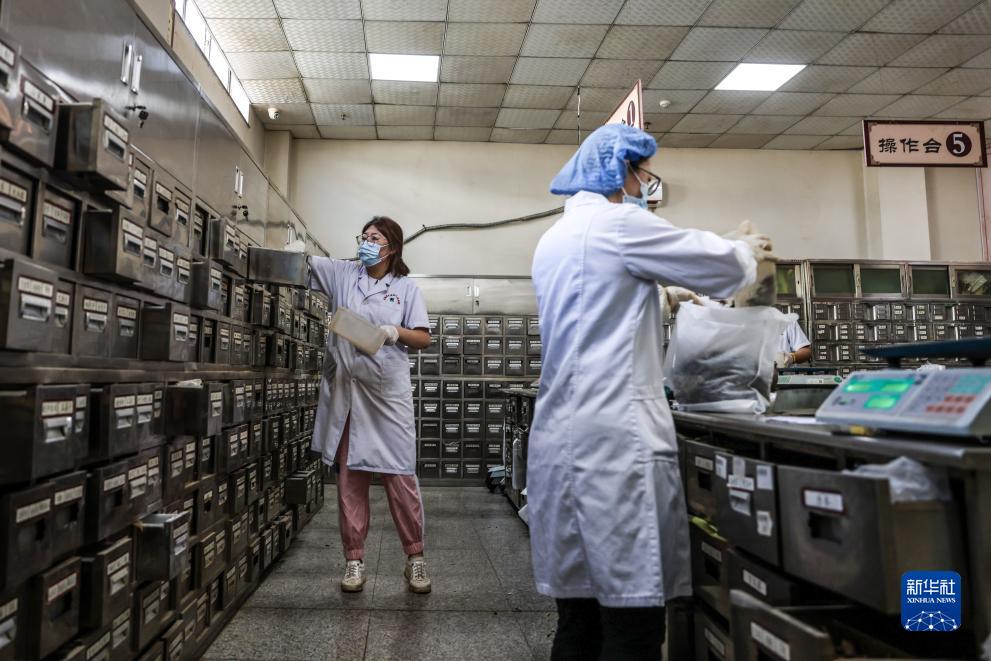 9月5日,在文登區人民醫院醫共體中藥配送中心,工作人員在制備中藥。