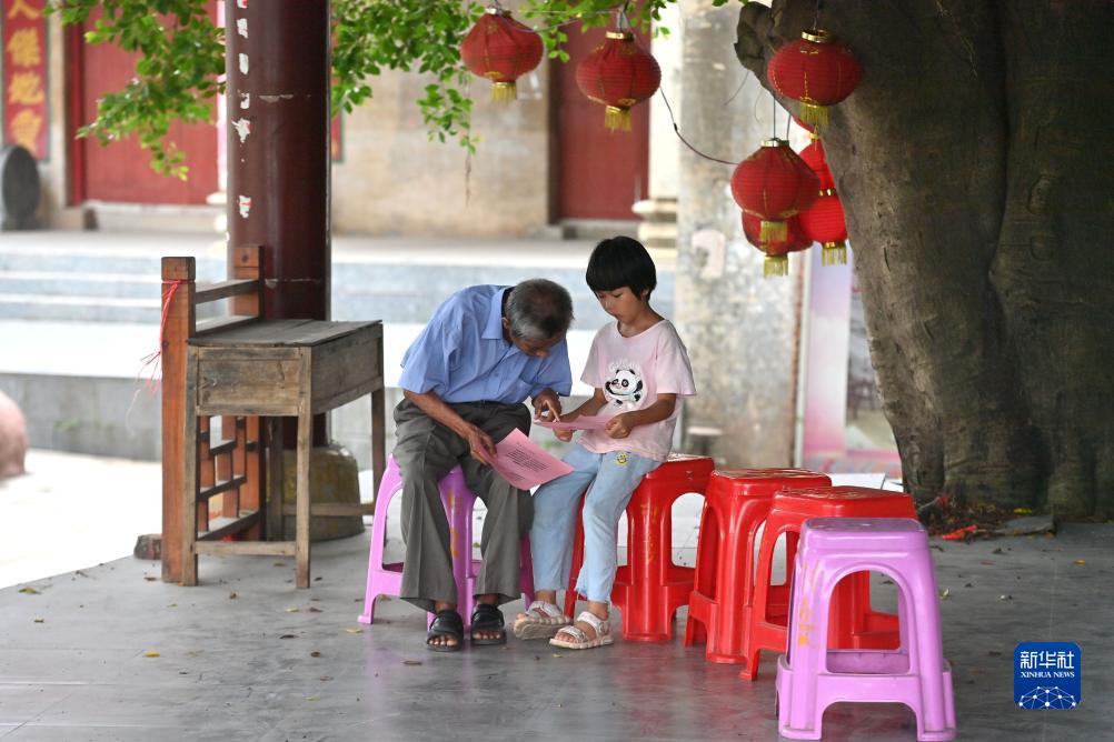 在梧州市長(cháng)洲區長(cháng)洲鎮泗洲村,陳明仲(左)在教小學(xué)生唱下俚歌(8月24日攝)。