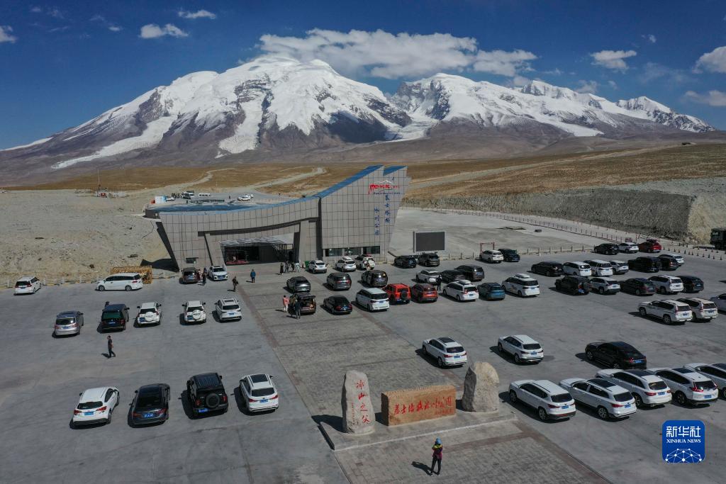 自駕游客的車(chē)輛??吭谛陆矌鞝柛伤俗灾慰h慕士塔格冰川公園門(mén)前(9月1日攝,無(wú)人機照片)。
