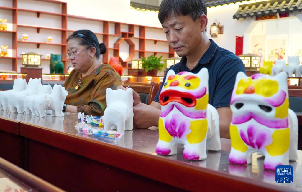 9月5日,在山東省高密市姜莊鎮的一處非遺工坊,非遺代表性傳承人聶宏希(右)在制作泥老虎產(chǎn)品。