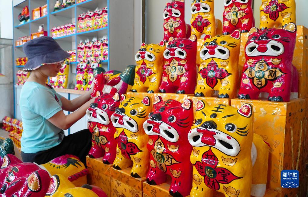 9月5日,在山東省高密市姜莊鎮的一處非遺工坊,一位村民在整理陳列的泥老虎產(chǎn)品。