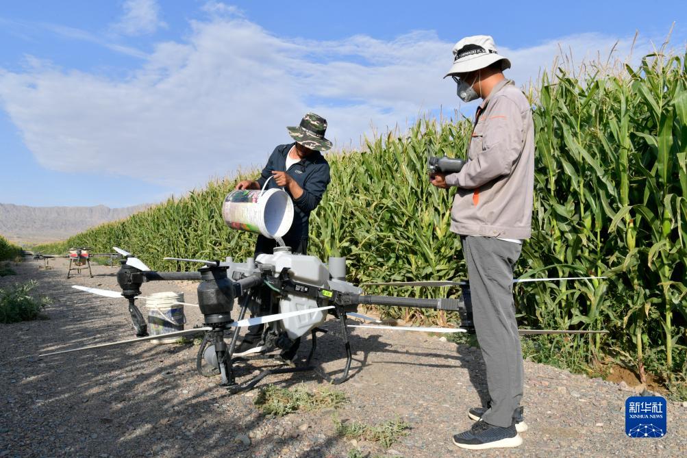 9月5日,在山丹縣位奇鎮十里堡村,技術(shù)人員開(kāi)展“一噴多促”準備工作。