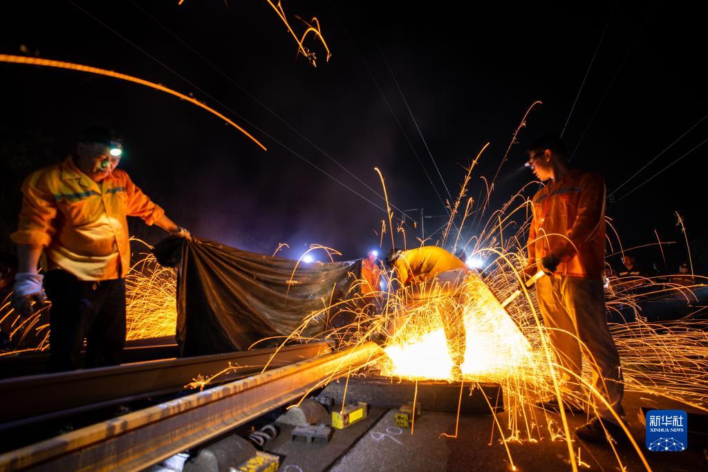 9月6日凌晨,在京廣高鐵株洲西至衡山西區間,鐵路工人使用切割機進(jìn)行鋸軌作業(yè)。