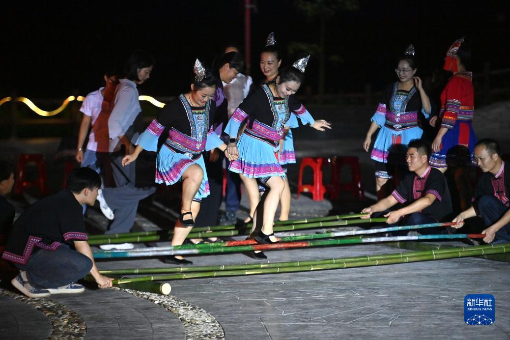 9月5日,在梧州市蒼梧縣六堡鎮山坪村同心廣場(chǎng),各族干部群眾在篝火晚會(huì )上跳竹竿舞。