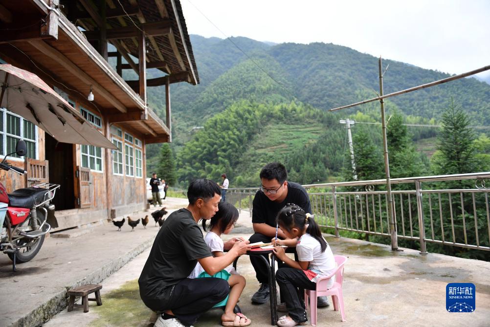 9月4日,報木小學(xué)的校長(cháng)段同山(左一)和教師羅瀟在學(xué)前班學(xué)生奉昕妤(左二)、鄒紫怡家中家訪(fǎng),教她們復習當天的學(xué)習內容。