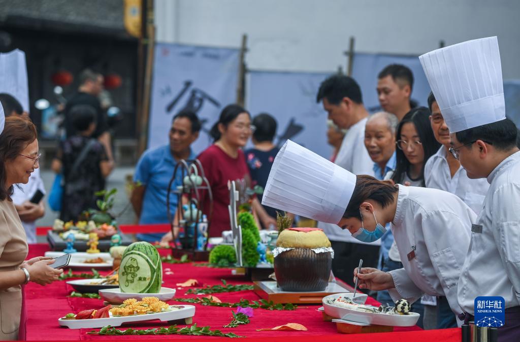 9月6日,在浙江省建德市壽昌古鎮開(kāi)幕的古鎮好吃節上,由建德市餐飲協(xié)會(huì )制作的“魚(yú)躍亞運”“騰龍飛天”“亞運定勝”“金牌滿(mǎn)堂”等多道亞運主題菜品在現場(chǎng)展示,吸引了眾多市民的眼球。