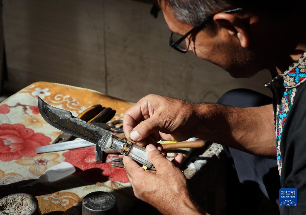 9月5日,手工藝人在英吉沙縣芒辛鎮喀拉巴什蘭干村制作小刀。