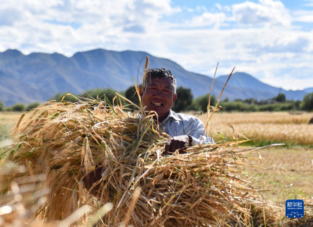 西藏日喀則市年楚河流域是西藏糧食的主產(chǎn)區之一,今年雨水豐沛,糧食長(cháng)勢喜人,大地鋪金,農民喜迎豐收。新華社記者 晉美多吉 攝