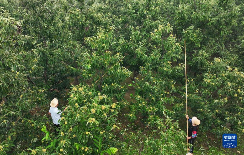 9月7日,河北省遵化市湯泉滿(mǎn)族鄉果莊子村的農民在果園收獲板栗(無(wú)人機照片)。